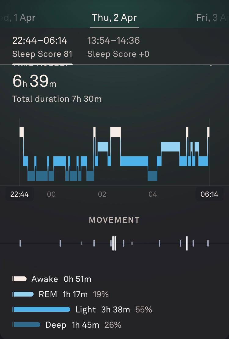 You may wonder why there is an outlier of 20-29 minutes. That was my first night in the Hut van Leon. I woke up several times because of lorries passing by the campsite. All figures from the lower spectrum pertain to my nights in the Hut van Leon. Despite the physical comfort, my sleep scores remained unimpressive.